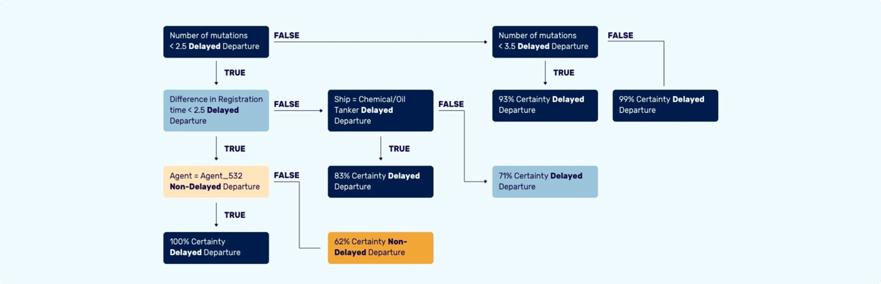 Een beslissingsboom wordt van boven naar beneden gelezen, waarbij bij elke splitsing een beslissing wordt genomen op basis van een ander kenmerk of een andere waarde van dat kenmerk. In de beslissingsboom voor Nederlands Loodswezen staat de kleur blauw voor vertraagde schepen en oranje voor niet-vertraagde schepen in de haven. Hoe donkerder de kleur van de doos, hoe meer zekerheid het model heeft in zijn beslissing.